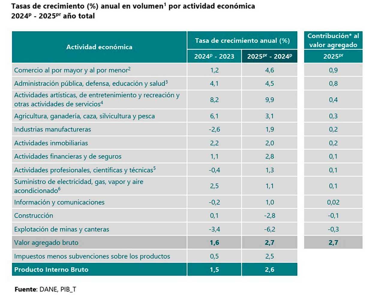 La economía colombiana registró un crecimiento de 2,6% durante 2025, de acuerdo con el más reciente informe del DANE. El resultado refleja una recuperación moderada, apoyada principalmente por el comercio, los servicios públicos y las actividades culturales y de entretenimiento.